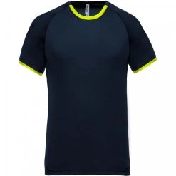 100% poliestere interlock. Maniche raglan. Banda di pulizia al colletto. Banda a contrasto sulla scollatura e sul fondo delle maniche. Cucitura tono su tono sul giromanica.